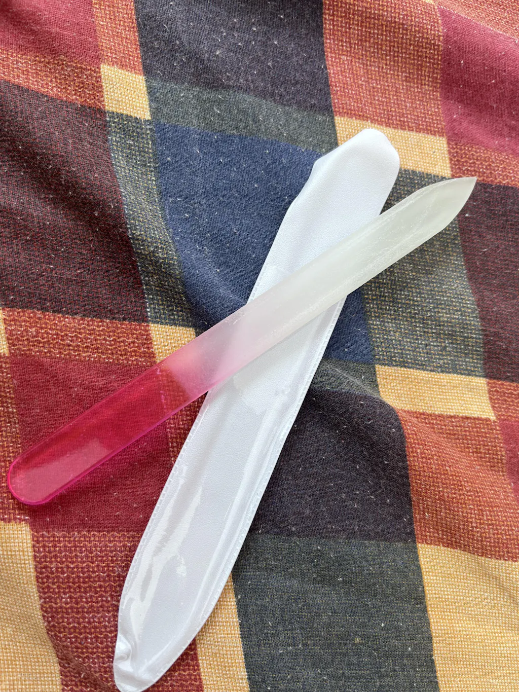 Las limas de cristal para uñas -o de vidrio- a diferencia de las de cartón, que se doblan, despegan o rompen, cuentan con una textura arenosa mucha más suave y fina. Lo que las hace ideales para acabados más limpios sin bordes porosos o rasgados, lo que significa un menor número de rupturas y accidentes en tu manicura.